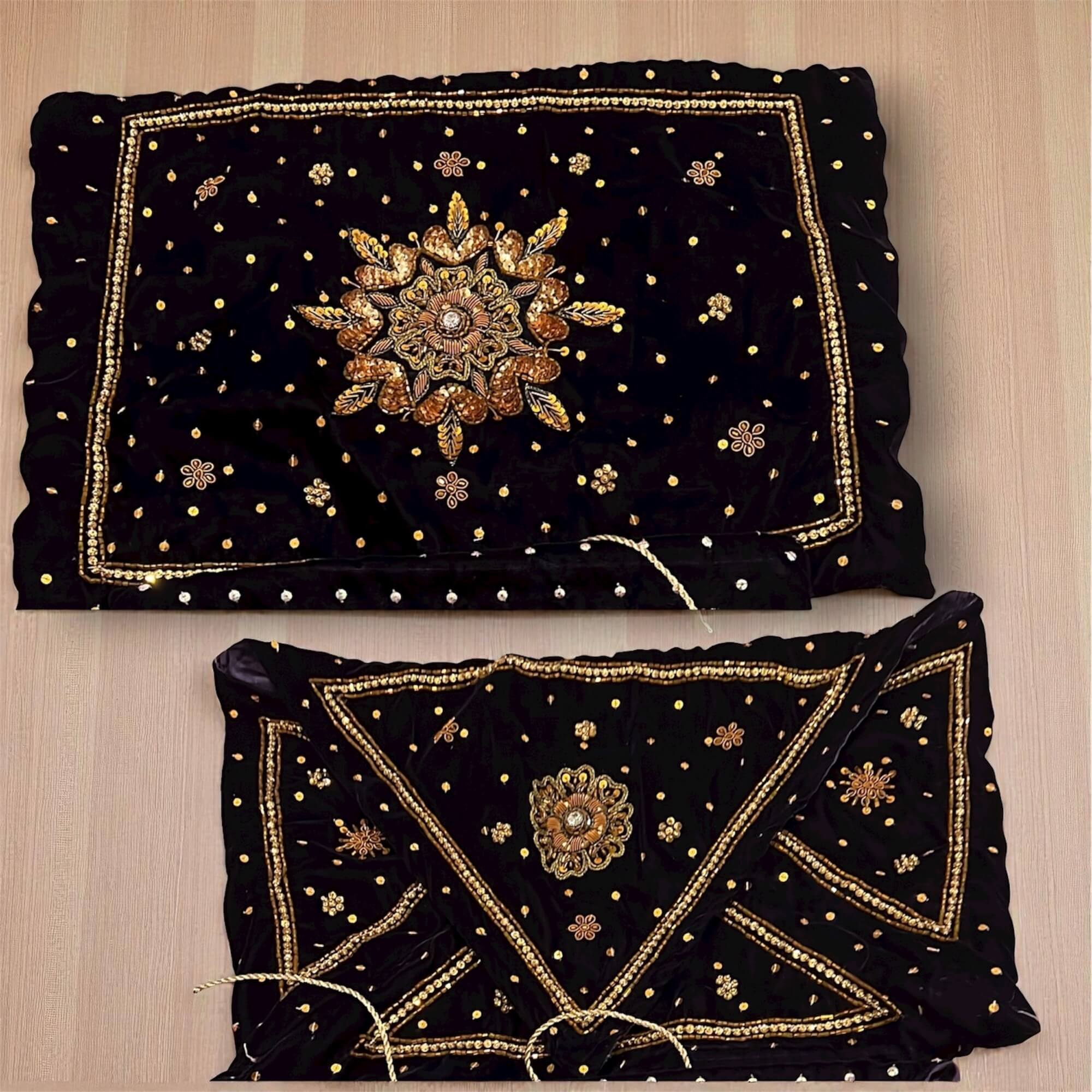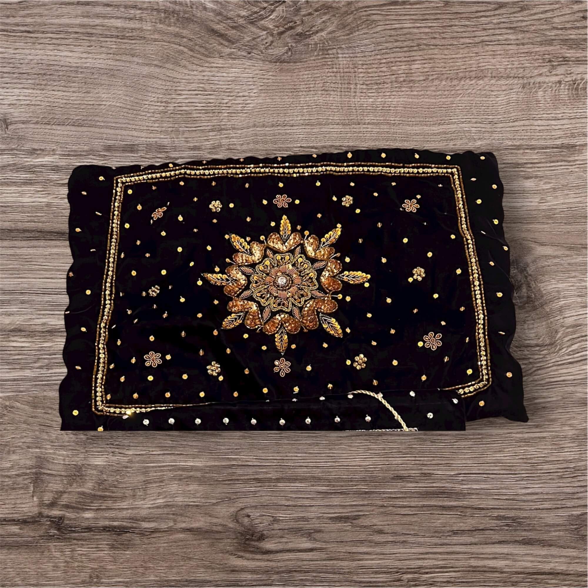 This Quran Cover is made on high quality velvet fabric and hand worked with embellishments and kora dabka. The size can be customised as per your choice.